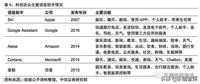 巨头密集布局互联网语音助手。语音助手是智能语音在个人用户上的主要应用形式,目前市场产品主要包括苹果Siri、微软Cortana、谷歌Assistant、亚马逊Alexa等。