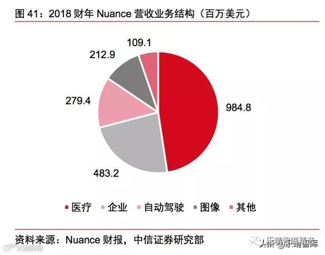 AI+医疗的海外龙头企业是Nuance,公司50%的业务来自智能医疗解决方案,而病历等临床医疗文献转写方案是医疗业务的主要收入来源。