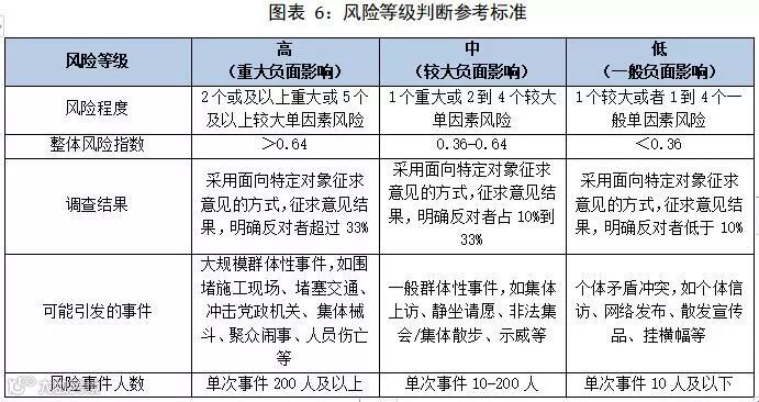 注:(1)本表所列各项评判标准只供参考;(2)以上标准,可根据当地社会稳定风险等级评判的有关规定,结合拟建项目特点,由相关部门或专家具体确定;(3)可通过风险估计结果与风险等级评判标准的对比,确定项目的风险等级。