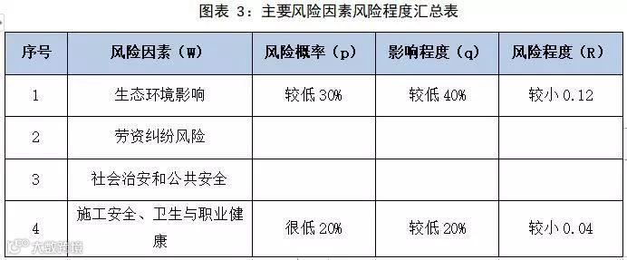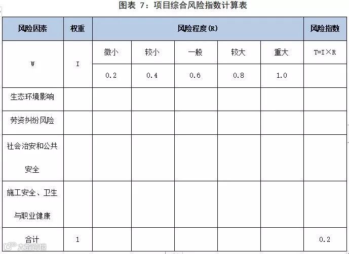 按照上述风险等级确定办法,根据每个风险因素的影响程度确定其权重,并且设定了风险程度值,最终得出了该项目的风险指数为0.20。