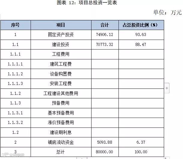 项目总投资80000.00万元,其中建设投资70773.32万元,建设期利息为4132.80万元,铺底流动资金为5093.88万元。