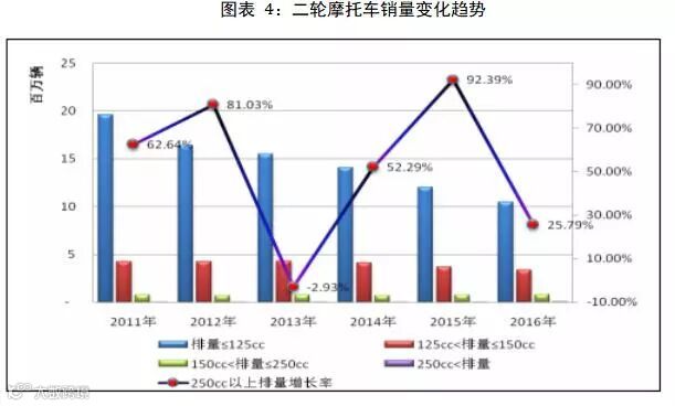 2011 年至2016年,250cc以上排量二轮摩托车销量已由7,210辆增至40,273辆,年均复合增长率达到41.06%;然而其中400cc以上排量摩托车一半以上从美国、日本等国企业进口为主,国内大排量摩托车企业主要以钱江摩托、隆鑫通用和春风动力为主。