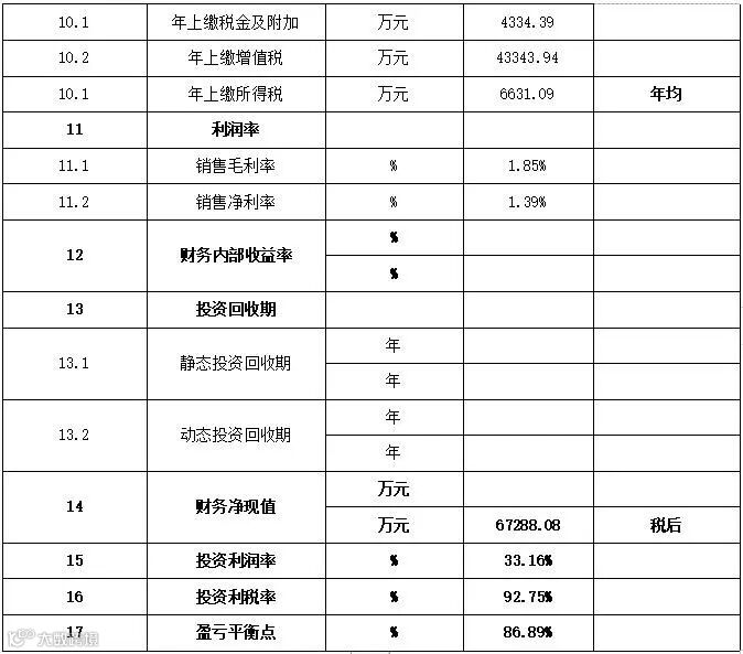 根据损益表,现金流量表,项目所得税后净现值内部收益率测算表,可进一步测算出动态反映本项目盈利能力的净现值NPV、内部收益率IRR、项目动态全部投资回收期Rt和投资利润率等指标。