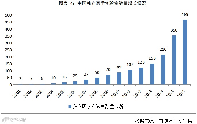 我国独立医学实验室真正起步于21世纪初,广州金域检验于2001年首先将独立医学实验室模式商业化运作,由此揭开我国独立医学实验室的发展进程。在医改不断深入以及专业化分工趋势下,我国第三方医学诊断呈现井喷式发展。据前瞻产业研究院统计,2001年国内仅有两所独立医学实验室,2005年增加到16所,截至2016年底,我国独立医学实验室数量猛增到468所,完成了跨越式突破增长。