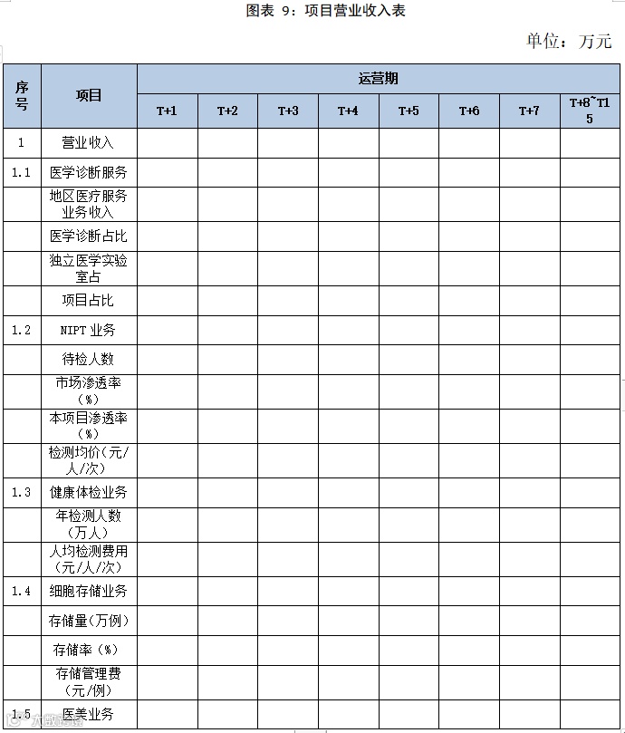 根据本项目发展阶段的不同,本项目盈利来源也有所不同。项目初期,项目主要收入来源为医学诊断业务、NIPT业务、健康体检业务、细胞存储业务以及美容保健业务产生的收入。经测算,项目运营8年后可新增营业收入***万元形成良性的资金链循环。