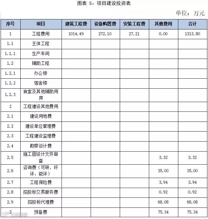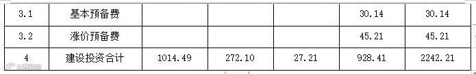 本项目的建设投资估算额为2242.21万元,其中,建筑工程费用1014.49万元,设备购置费为272.10万元,安装工程费用27.21万元,工程建设其他费用为853.07万元,预备费为75.34万元。具体详见下表: