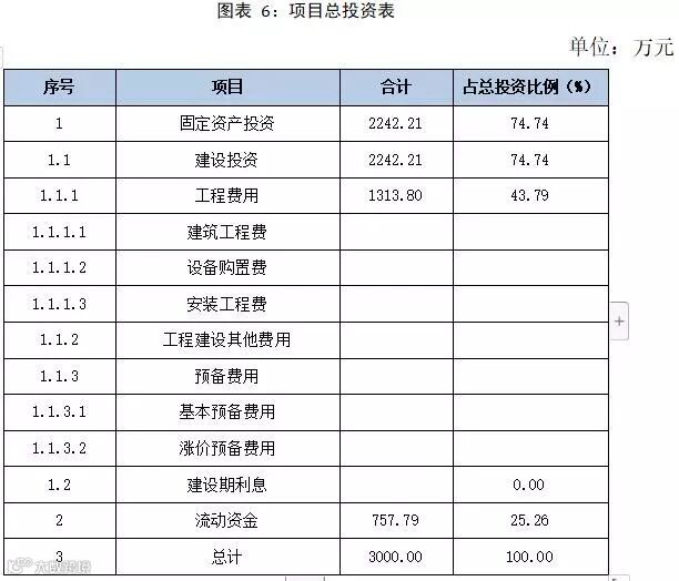本项目总投资3000.00万元,其中,固定资产投资为2242.21万元,流动资金为757.79万元。项目总投资估算见下表所述。