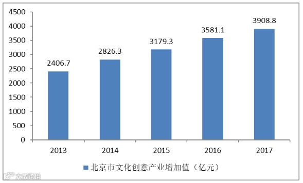 根据《北京市2017年国民经济和社会发展统计公报》统计,2017年,北京文化创意产业实现增加值3908.8亿元,现价增长9.2%;占地区生产总值的比重为14.0%,与上年持平。2017年全市文化创意产业资产总计40912.6亿元,收入合计21794.6亿元,从业人员201.1万人。其中,规模以上文化创意产业法人单位收入合计16196.3亿元,同比增长10.8%,从业人员125.1万人,同比增长0.3%。