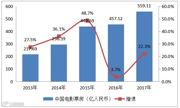 根据数据,2017年中国电影总票房达到559.11(含服务费)亿元,同比增长13.45%,较2016年同期增速回暖明显。城市观影人次达16.2亿人,同比增长 11.19%;新增银幕9597块,总量达到50776块,超越北美市场成为全球第一,与此同时统计的北美市场2017年的总票房为709亿元,同比减少4.3%,已连续五年处于增长停滞。