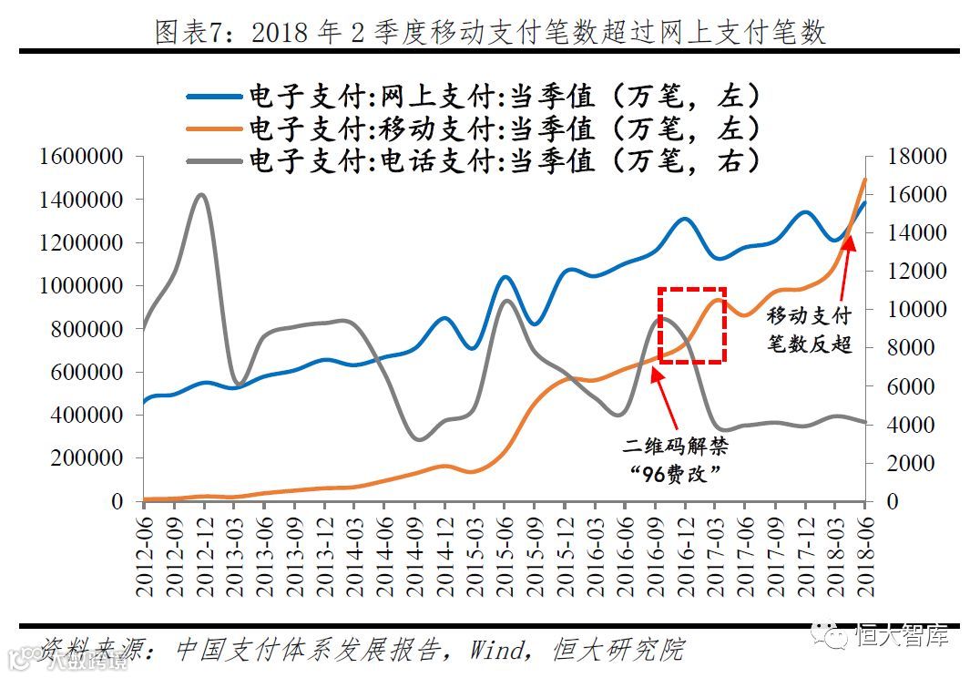 移动支付笔数与网上支付笔数的差距逐渐缩小并实现反超,二维码支付功不可没。二维码解禁,移动支付对网上支付和现金支付的替代效应越来越明显,2016年6月,网上支付笔数110.27亿次,是移动支付笔数的1.8倍,而2018年6月,移动支付笔数149.24亿次,已经超过网上支付笔数,二维码支付解禁是移动支付得以迅速发展的重要原因。