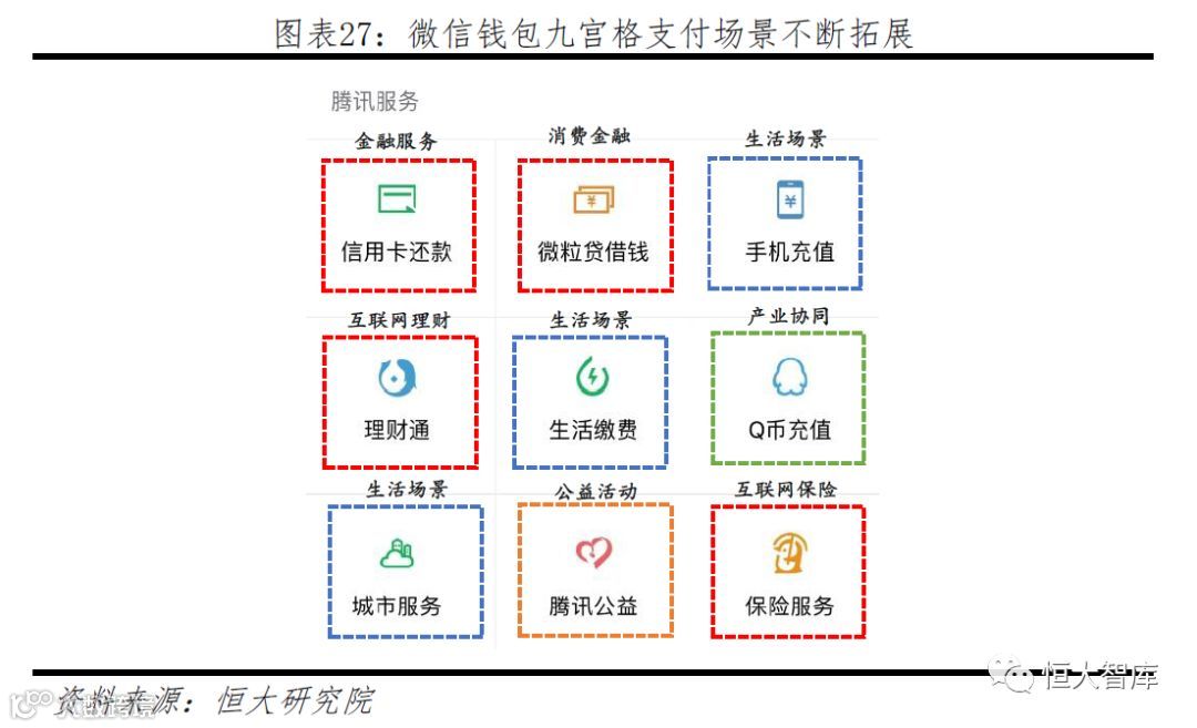 第四步,持续赋能,涉足金融。微信九宫格出现微粒贷借钱、信用卡还款、理财通、保险服务等金融服务,九宫格中金融服务占四,金融场景在移动支付中的地位可见一斑。微信支付通过金融场景的拓展,不断为支付赋能,扎根消费互联网。