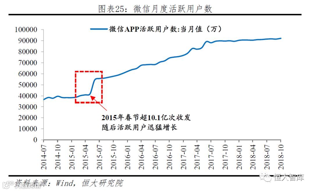 第二步,社交转账,实时转账。立足2014年春节微信红包的强势爆发,微信逐步拓展社交支付,社交转账、实时转账的便捷性促进微信支付渗透率实现跨越。2015年春节微信支付“摇一摇”在春节期间实现10.1亿次收发,随后活跃用户数从2015年1月的3.8亿跨越至6月的5.4亿,进一步奠定了微信支付在社交转账、实时转账领域的核心地位。