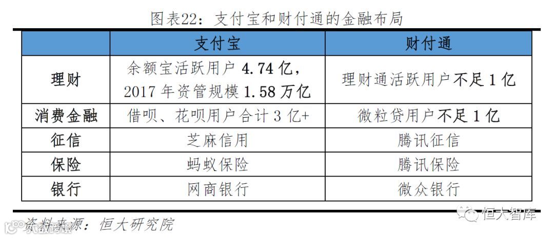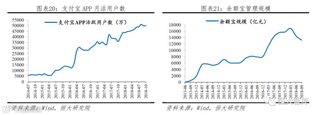 第三步,发展科技,布局金融。2013年6月,余额宝上线,互联网理财逐渐发展,余额宝用户超4.74亿,资管规模1.58万亿;2013年8月支付宝用户不再绑定信用卡或储蓄卡,即可直接透支消费,后期发展出花呗、借呗等消费金融业务,用户超3亿;此外,芝麻信用渐受认可,成为重要的征信来源,蚂蚁保险在财险、寿险等领域全面布局,支付宝的全方位金融服务体验更佳。