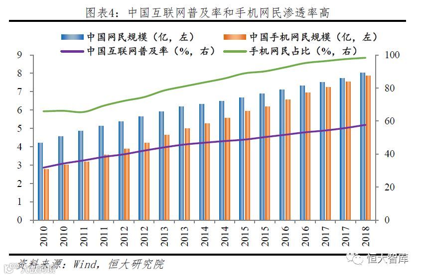 中国互联网普及率全球第一,手机网民数量占比98.3%。截至2018年6月底,中国网民数量达8.02亿,互联网普及率达到57.7%,全球排名第一;手机网民规模7.88亿,手机网民占整体网民的比例高达98.3%;截至2018年9月,4G用户数合计11.4亿,覆盖99%居民。网络覆盖广泛、移动互联网普及率高,成为中国移动支付发展的基础和强大助推力。