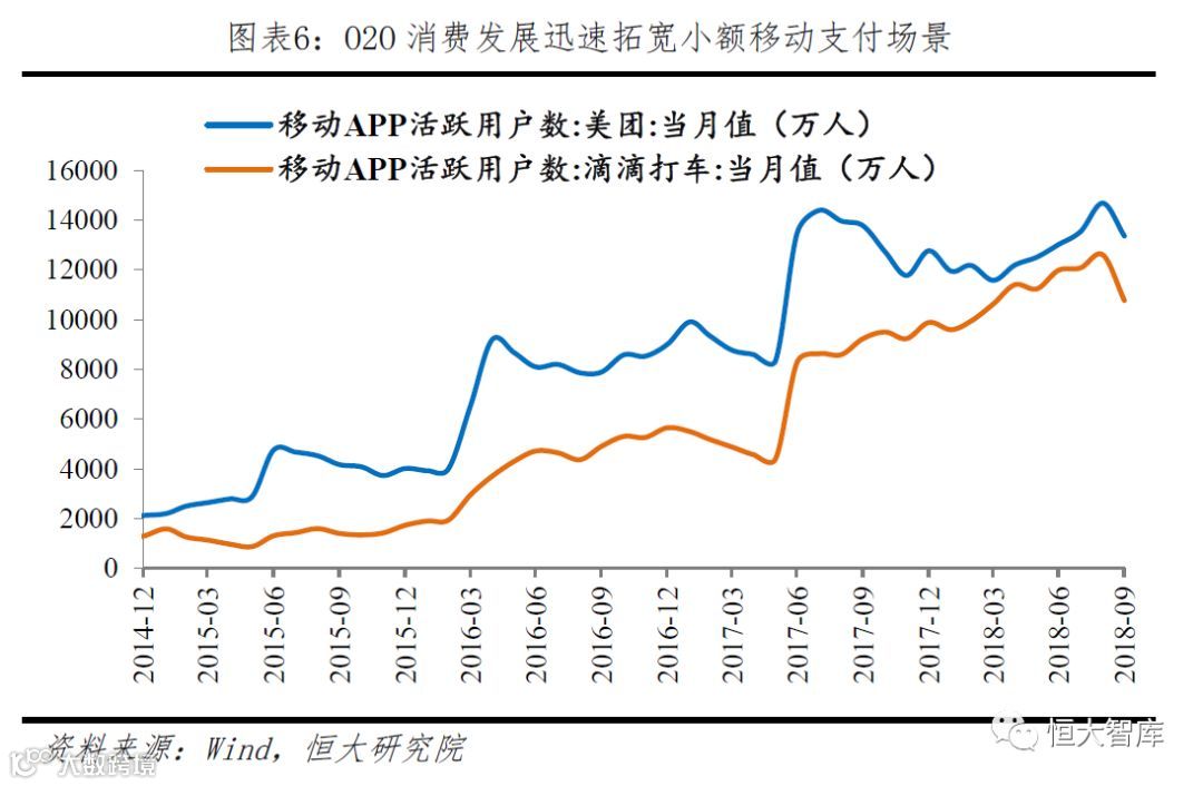 外卖、打车等O2O消费快速发展,小额支付场景拓宽,移动支付逐渐取代现金支付。除网络购物外,外卖、打车逐渐成为中国人生活、出行的重要方式,以美团外卖和滴滴打车为例,2018年9月的月活用户数就已分别达到1.34亿和1.08亿,小额现金支付逐渐淡出中国人的生活。