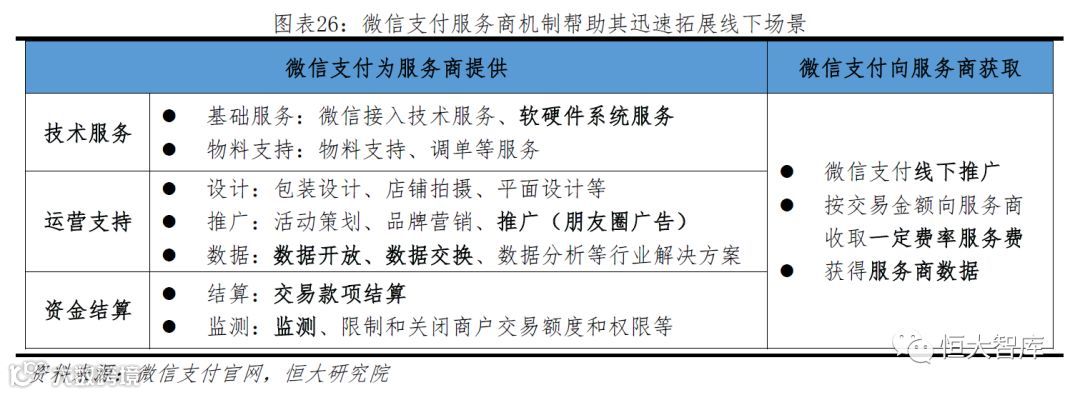 第三步,线下支付,服务商制。在社交支付发展成熟的基础上,微信开始探索线下支付,采取服务商机制,与服务商互利互惠,一方面,微信支付为中小商户提供技术服务、运营支持和资金结算服务,另一方面,中小商户承担了微信支付的线下推动任务。因此,2016年微信支付在线下迅速取得突破,接入线下门店超30万家,交易规模短期内迅速猛增,在线下支付领域筑起护城河。