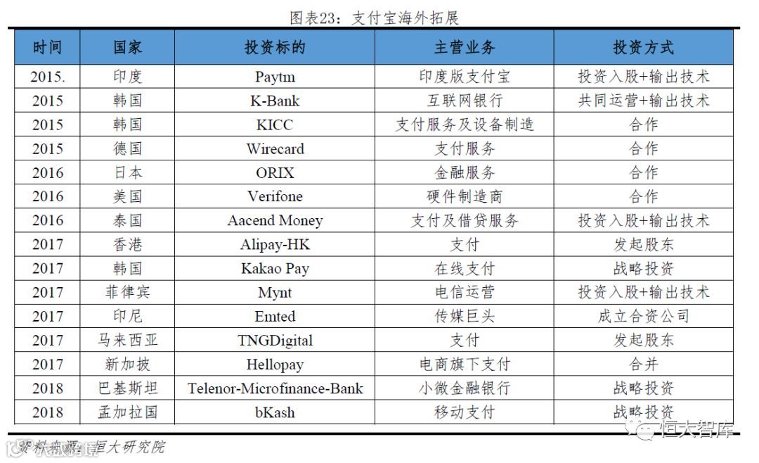 第四步,海外扩张,技术输出。随着国内市场的饱和,支付宝瞄准中国海外旅游人群和海外客户,实行技术出海战略,建立战略合作关系、购买股份、合并或组建合资公司的方式推广金融服务,提供技术和风控系统支持,帮助合作伙伴实现产品本地化。典型的案例如印度的Paytm,在支付宝的技术支持和帮助下,其用户从2017年4月的3000万增长到2017年末的2.2亿,超过了Paypal,成为全球第三大数字钱包。