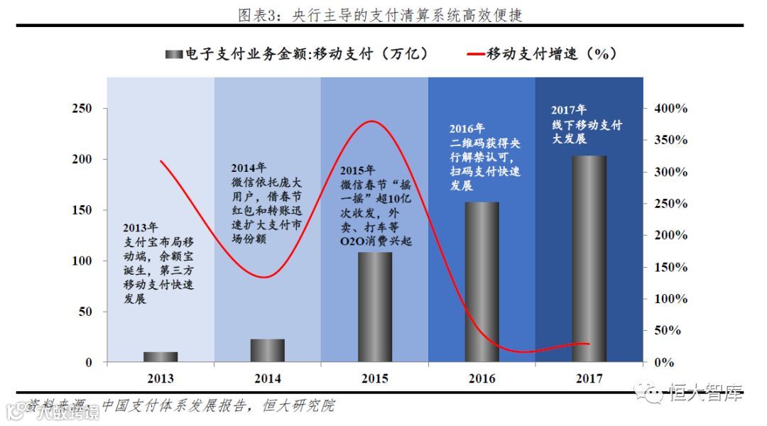 受益于移动互联网的普及和移动支付政策的支持,中国移动支付蓬勃发展,2013-2017年,移动支付规模实现21倍增长,由2013年不足10万亿,增长至2017年的202.93万亿,平均增速181%。2013年支付宝布局移动端、2014年微信红包春节爆发等都为移动支付的发展提供了良好的契机。