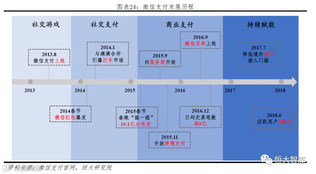 第一步,红包社交,金融游戏。微信红包诞生于2013年8月,凭借近微信近3亿社交用户,促进了社交金融小游戏“微信红包”在2014年春节的爆发,成功奠定了微信支付的市场地位。