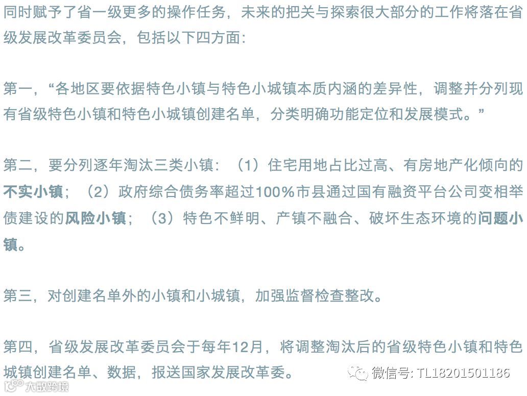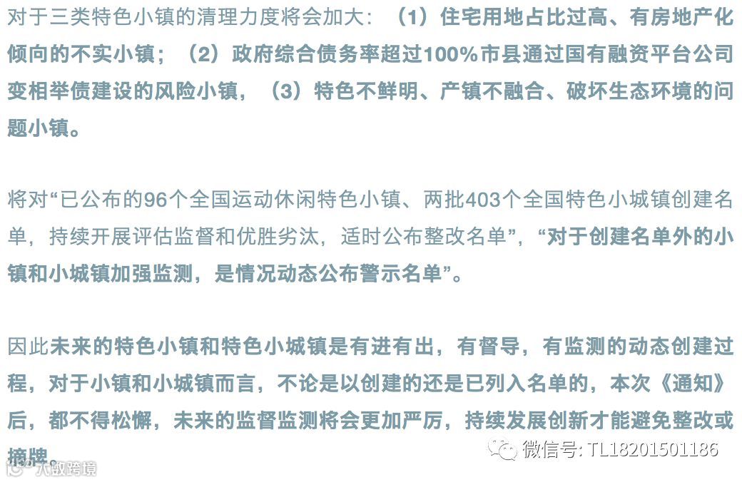本次国家发改委1401号文件《通知》的一个重要基调就是“纠偏”,对于前期“概念不清、盲目发展及房地产化苗头”进行纠错,要“严格遵循发展规律、严控房地产化倾向、严防政府债务风险为底线”,“建立规范纠偏机制”。要“坚持规范发展”,“规范特色小镇和特色小城镇创建工作,把握内涵、纠正偏差、正本清源,坚决淘汰一批确实产业前景、走形变样异化的小镇和小城镇。”