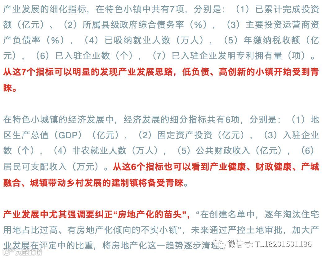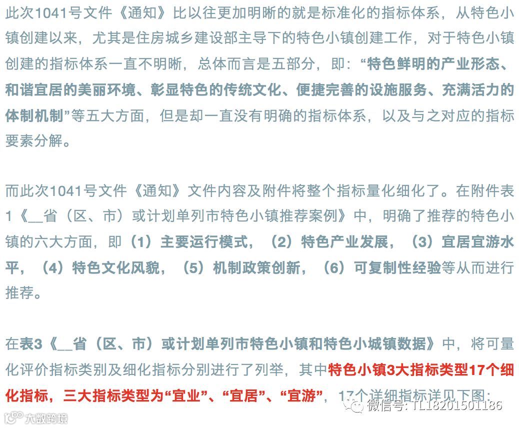 关注产业,关注产业健康发展,这一点在特色小镇和特色小城镇的数据表里面可以明显看到。特色小镇的指标类型排列中,“宜业”放在首位,“宜居”排在第二位,“宜游”排在第三位,而在特色小城镇数据指标类型中“经济发展”放在首位,“公共服务”放在第二位,“绿色生态”放在第三位,这就与之前三部委《关于开展特色小镇培育工作的通知》文件中“休闲旅游、商贸物流、现代制造、教育科技、传统文化、美丽宜居”的排位顺序完全不同了,因此产业优先成为了这次1041号文件《通知》的关键导向,之前许多地方将特色小镇建设解读为旅游休闲小镇建设的错误将不会再出现。