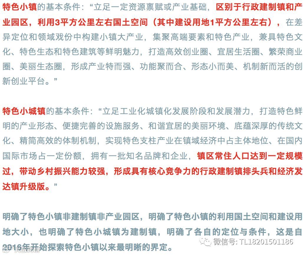 此次1041号文件《通知》另一个亮点就是明确了典型特色小镇和特色小城镇的条件,以往的特色小镇创建中,特色小镇和特色小城镇的标准是模糊的,没有明确的进行界定。此前住房城乡建设部《关于开展特色小镇培育工作的通知》并未对特色小镇的条件、范围、大小进行界定,直至国家发改委2016年12月《国家发展改革委关于加快美丽特色小(城)镇建设的指导意见》发改规划〔2016〕2125号提出:“以镇区常住人口5万以上的特大镇、镇区常住人口3万以上的专业特色镇为重点,兼顾多类型多形态的特色小镇,因地制宜建设美丽特色小(城)镇。” 四部委联合印发的《关于规范推进特色小镇和特色小城镇建设的若干意见》(发改规划〔2017〕2084号中明确特色小镇“规划用地面积控制在3平方公里左右,其中建设用地面积控制在1平方公里左右,旅游、体育和农业类特色小镇可适当放宽”,但仍未区分特色小镇与特色小城镇,本次1041号文件,明确了特色小镇、特色小城镇的基本条件,这是又一大亮点。