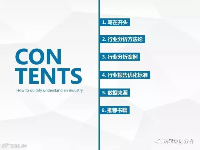 内容主要有:如何建立知识体系?如何找到合适的主题?如何确定分析框架?如何寻找数据源?以及分析报告的编写流程与标准、行业分析案例、常用的方法论等等……