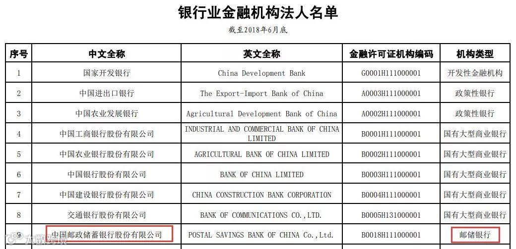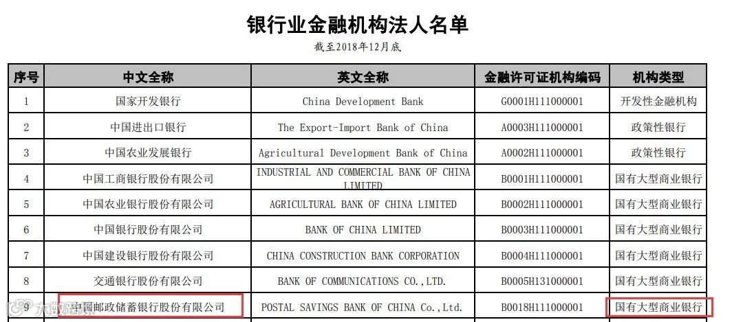 在中国银保监会日前披露的银行业金融机构法人名单中,中国邮政储蓄银行的机构类型被列为国有大型商业银行,与工商银行、农业银行、中国银行、建设银行、交通银行同列。