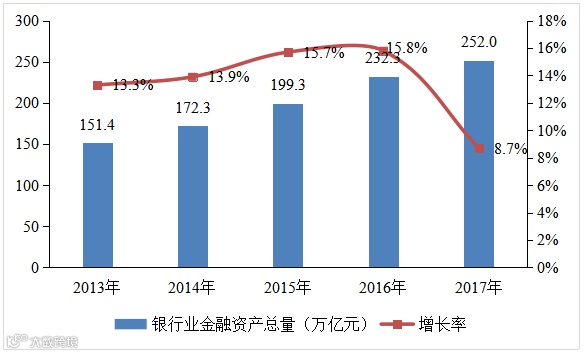 2017年我国银行业金融资产总量达到252万亿元人民币,相对于2016年增长了8.7%,从下图中可以看出,我国银行业金融资产总量一直在稳步增长,但大部分金融资产缺乏流动性,不能够流通创造更多财富。
