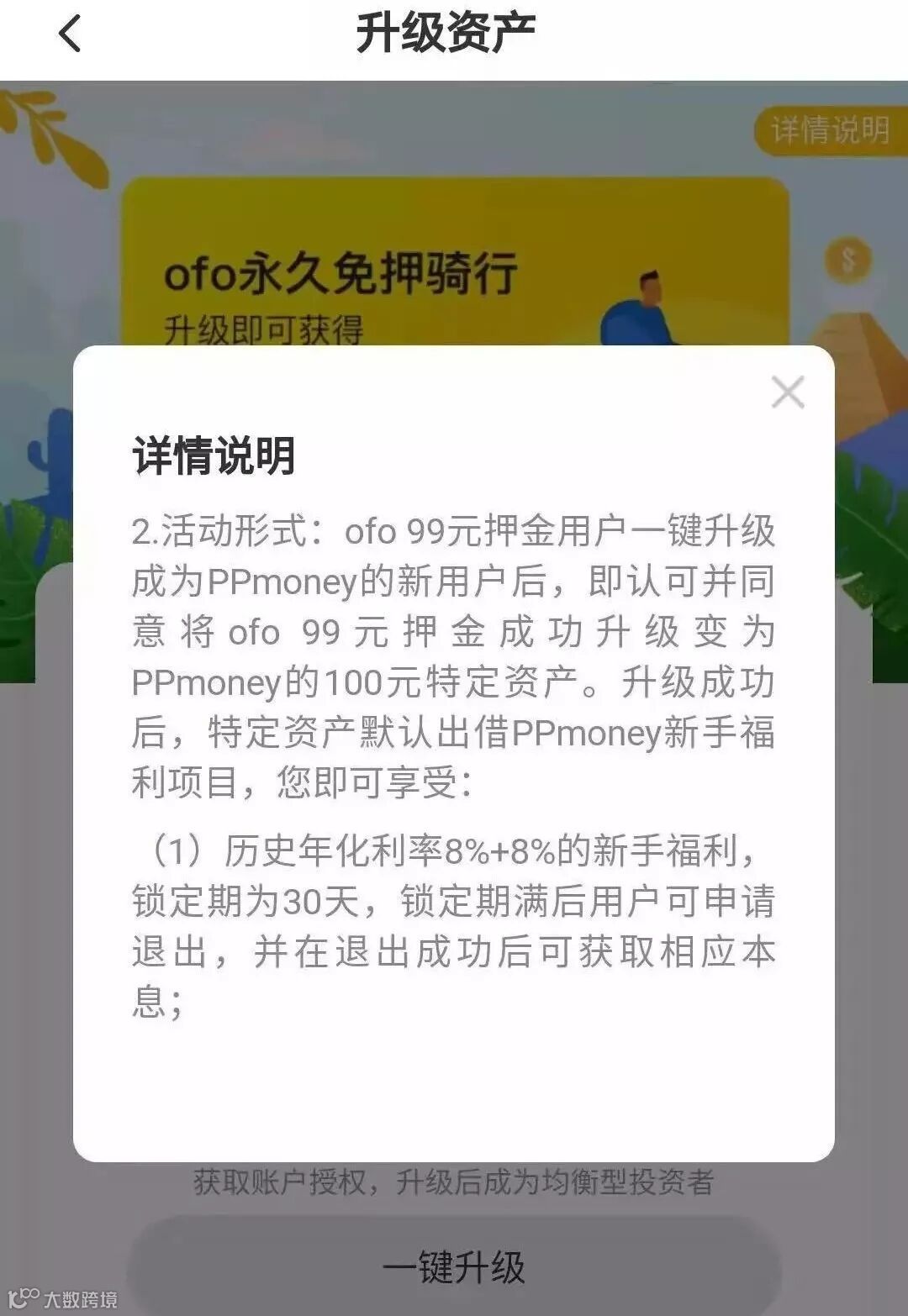 2.点击一键升级,你的押金就不归ofo小黄车了,而是归PPmoney公司所有,要退押金找PPmoney。