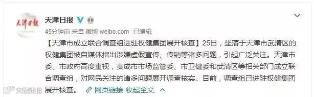 好消息是,截至发稿前,收到权健被查的消息:天津市委、市政府高度重视,责成市市场监管委、市卫健委和武清区等相关部门成立联合调查组,对网民关注的诸多问题展开调查核实。目前,调查组已进驻权健集团展开核查。