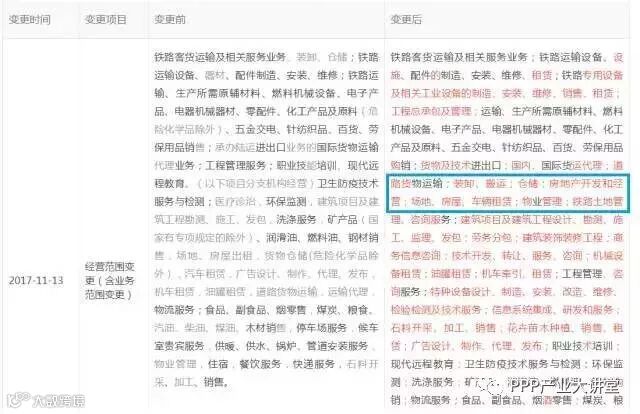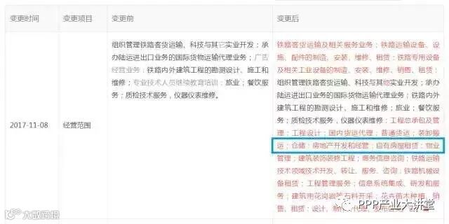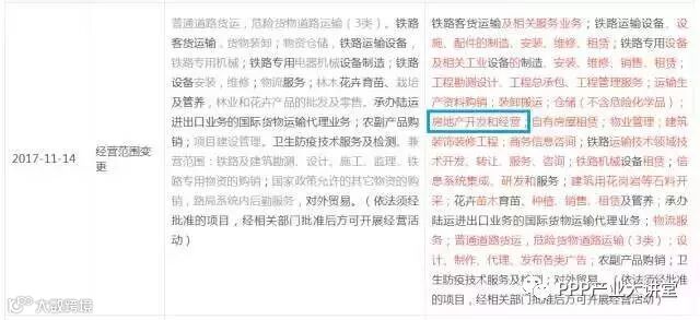 这是一家企业2017年11月14日变更经营范围“公示信息”的截图(点击可放大查看),很明显,这家企业新增了“房地产开发和经营”。而它原来的主营业务是:铁路客货运!
