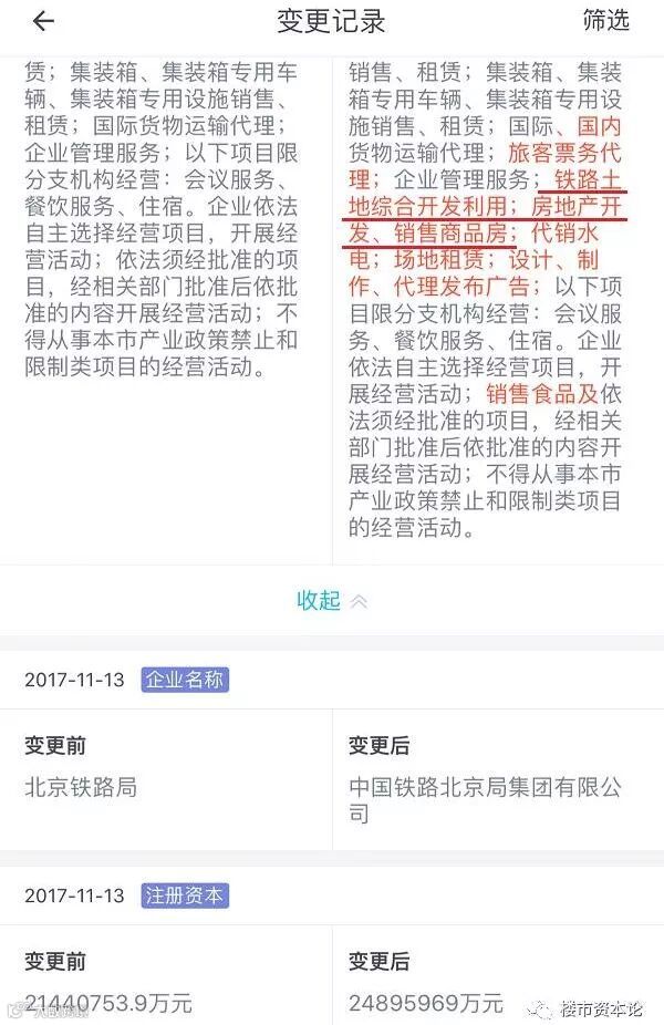 楼市资本论查询了下铁总下属中国铁路北京局集团有限公司的资料,最新工商信息变更登记记录显示,经营范围多了“铁路土地综合开发利用,房地产开发,销售商品房”等内容。