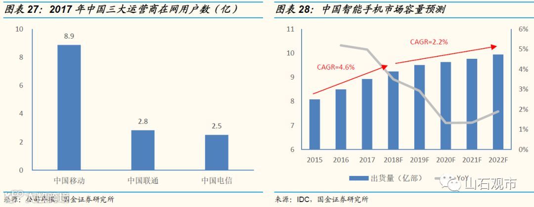 根据中国三大电信运营商披露的数据,2017年的合计用户数为14.2亿(可以理解为在网的SIM卡数量)。国金证券研究创新中心通过技术手段跟踪到中国在网的智能手机数量达10亿部左右。