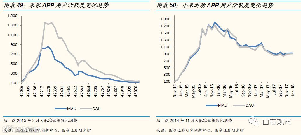 结果很有趣,随着小米智能产品快速放量,配套APP的注册用户数和活跃用户数也同步大幅上升,然而不久之后,活跃用户数量即开始大幅下降。
