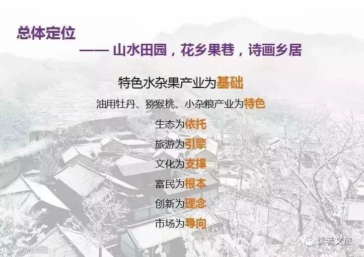 该项目以“山水田园,花乡果巷,诗画乡居”为定位,建设以特色水杂果产业为基础,以油用牡丹、猕猴桃、小杂粮产业为特色,以生态为依托、旅游为引擎、文化为支撑、富民为根本、创新为理念、市场为导向的特色鲜明、宜居宜业、惠及各方的国家级田园综合体。