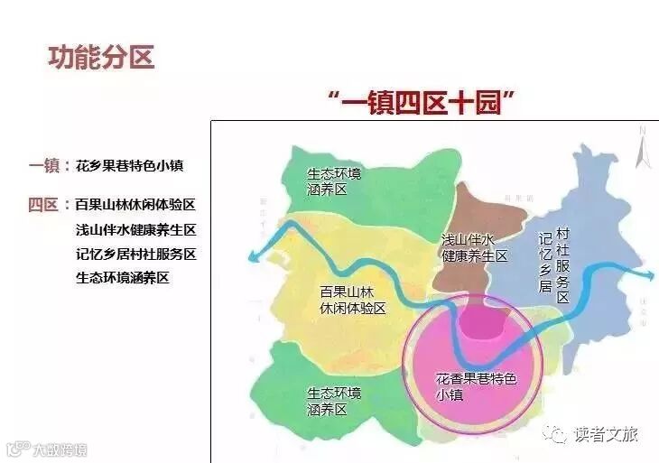 整个项目区域划分为“一镇四区十园”,一镇即花乡果巷特色小镇;四区即百果山林休闲体验区、浅山伴水健康养生区、记忆乡居村社服务区,生态环境涵养区;十园即十大项目产业园,主要包括梨花坡富贵牡丹产业园、五海猕猴桃庄园、黄岩百果庄园、松山峪森林公园、莲花院颐养园、神农杂粮基地、CSA乡村公社、游客集散中心、玉泉农庄、乡村社区旅游廊道。
