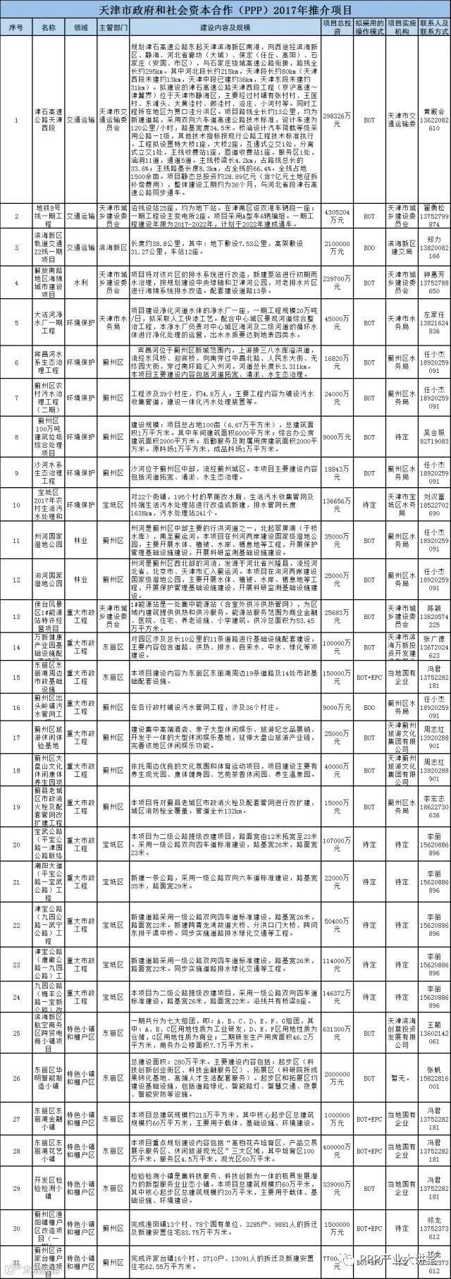 天津市发改委推介31个PPP项目,总投资1469亿元,涉及交通运输、水利、环境保护、林业、重大市政工程和特色小镇及棚户区六个领域,其中与基建相关的23个,投资超1438亿元。