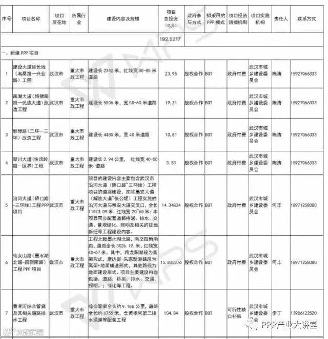 武汉市推15个PPP项目,总投资728.16亿元,涵盖市政道路、人工智能、综合管廊、城镇污水处理、产业园基础设施等领域,其中与基建相关的项目7个,投资192.52亿元。