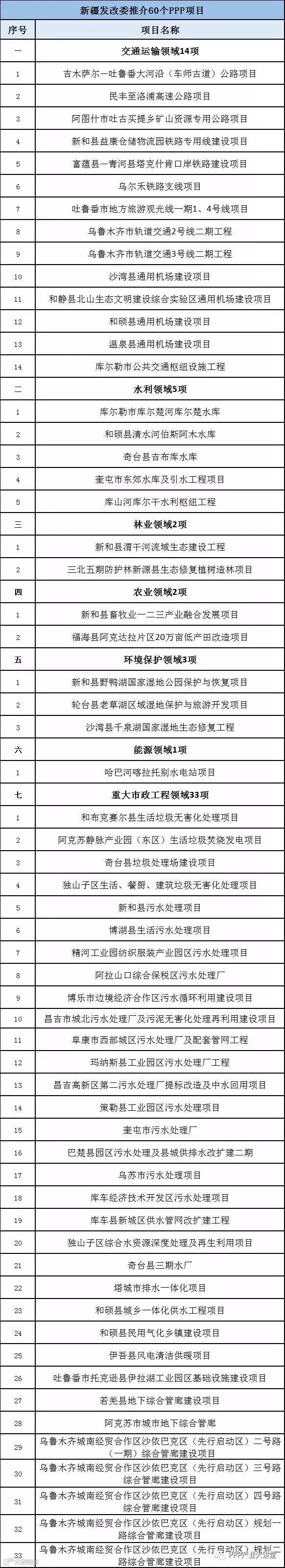 新疆维吾尔自治区发改委推介60个PPP项目,总投资559.12亿元。包括:交通运输领域项目14项,总投资368.2亿元;水利领域项目5项,总投资40.58亿元;林业领域项目2项,总投资4.6亿元;农业领域项目2项,总投资5.3亿元;环境保护领域项目3项,总投资14.67亿元;能源领域项目1项,总投资20.2亿元;重大市政工程领域项目33项,总投资105.57亿元。