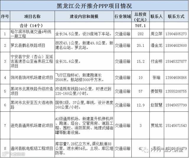 黑龙江省发改委、财政厅联合推介交通运输、水利、重大市政工程等14个PPP项目,总投资707.1亿元。