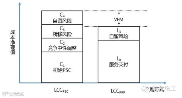 定量评价是在假定采用PPP模式与政府传统投资方式产出绩效相同的前提下,通过对PPP项目全生命周期内政府方净成本的现值(PPP值)与公共部门比较值(PSC值)进行比较,判断PPP模式能否降低项目全生命周期成本。PSC 是假设项目由政府融资、拥有和运营,并且能够运用最有效率的方式向公众提供产品或服务,再把政府和企业运作项目的区别和风险综合考虑进去的全项目生命周期现金流的净现值。