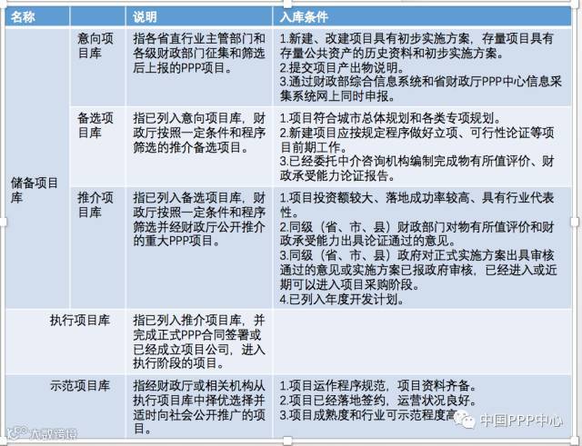3、示范项目库。指经财政厅或相关机构从执行项目库中择优选择并适时向社会公开推广的项目。入库条件:一是项目运作程序规范,项目资料齐备。二是项目已经落地签约,运作情况良好。三是项目成熟度和行业可示范程度高。