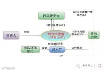 从表面看这个模式可能没有问题,但是这里存在一个最大的问题,建发公司是污水处理特许经营公司的股东,园区管委会是授予特许经营权的政府方,如果他们是独立的主体,这个结构没问题。但是在我们国家园区管理体系里面,园区管委会和建设发展公司往往是一批人马两块牌子,严格来说他是一个主体,这样就存在问题,当污水处理厂污水不达标时,园区管委会最怕这样的事情,一旦污水处理不达标,会对管委会追究责任,如果他与污水处理厂只有监管关系,他不是第一责任主体,第一责任主体是社会投资方的特许经营公司,如果他在里面有股权,他可能就脱不了干系,就要负直接责任。这是他们最怕的一个问题。另外当排污企业与污水处理厂发生合同纠纷时,本来作为地方行政管理部门的管委会是可以协调他们之间关系的,但由于他在里面占有股权,说话就不那么硬气了。把这两个问题指出来之后,政府方也发现这个结构不太好,所以我们给他换了一种结构,就是把建设发展公司拿出去,只有园区管委会。如下图。