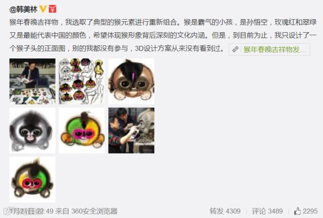 与此同时,3D版猴子形象遭遇了网友大量吐槽。对此,原稿设计者国家一级美术师韩美林表示,他从来没见过3D成稿。