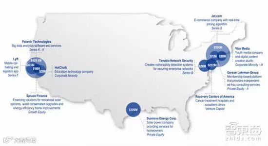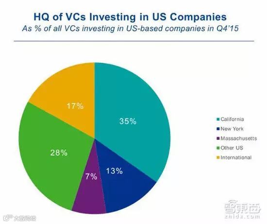 对于美国2015年Q4获得的风投,其中55%来自加拿大(35%)、纽约(13%)和马萨诸塞州(7%)。其他投资来源包括了伊利诺斯州、宾夕法尼亚州和科罗拉多州,以及国际投资者诸如英国、中国等。