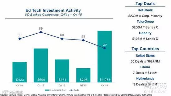 Q4投资唯一呈上升趋势的是教育,交易金额较Q3暴涨3倍,涵盖了创新型的教育技术和互动学习应用程序(MOOC)等。主要包括与大学合作的HotChalk、语言培训公司TutorGroup和硅谷的终生学习公司Udacity。