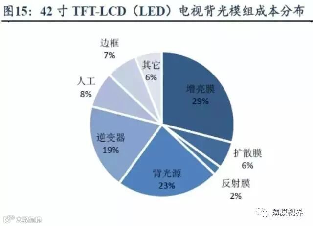 光学膜是背光模组的核心元件,在背光模组成本中占比最高。背光模组的光学膜片常见架构中,通常由1张反射膜+1张下扩散膜+2张增亮膜+1张上扩散膜组成, 光学膜片是背光模组中成本占比最高的组成。以42寸TFT-LCD(LED)面板为例,光学膜占背光模组成本的37%左右,占液晶模组总成本的17%左右。其中,反射膜、扩散膜、增亮膜所占成本比例分别为2%、6%和29%,增亮膜是最关键的组成部分。
