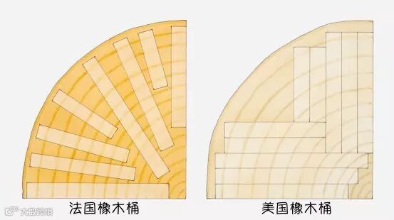 欧洲橡木和美国橡木有很多属性上的不同。以法国橡木为例,法国的很多橡木林很多出自拿破仑时期,因为法国气候整体比较冷凉,所以橡木的生长周期长,纹理也更细;而美国橡木相对生长期较短,且橡木出自不同林区的混合。在处理方法上,法国橡木桶一般是按照纹理切割,对橡木利用率较低(20%左右),而美国橡木桶对橡木的利用率可达50%左右。