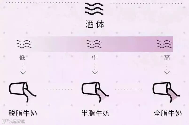 首先酒体并非人们所认为的酒的轻重,也就是酒的重量。酒体轻重其实是由舌头中间偏后的部位来感觉的,酒体的轻重我们可以用牛奶做例子:
